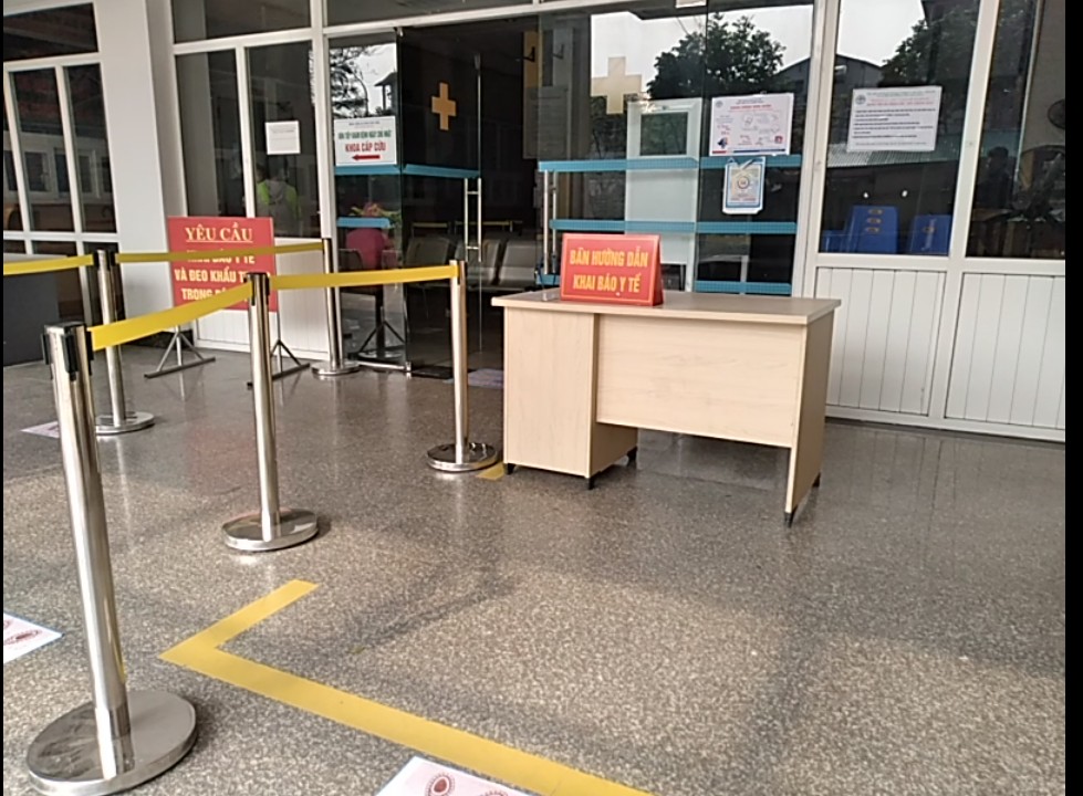 Tại khu vực đón tiếp trước bệnh viện và các Khoa, Phòng không có nhân viên y tế kiểm tra thân nhiệt, hướng dẫn khai báo y tế, đeo khẩu trang và sát khuẩn tay nhanh cho bệnh nhân và người nhà, những người vào bệnh viện