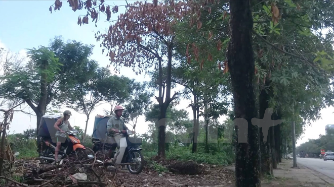 Hai người đàn ông chở xác cá chết ra khỏi khu vực hồ Linh Đàm (Ảnh: PV/Vietnam+)
