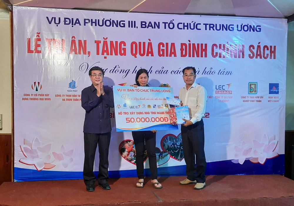 Đồng thời, đoàn công tác còn trao số tiền 50.000.000 đồng hỗ trợ xây nhà tình thương cho cho gia đình bà Võ Thị Gái (sinh năm 1969) tại thôn Minh Thành, xã Hàm Minh, huyện hàm Thuận Nam. Được biết, gia đình bà Võ Thị Gái có hoàn cảnh vô cùng khó khăn, chồng mất do bệnh tai biến, nhà có 3 người con. Trong đó, hai người con lớn đã lập gia đình và ở riêng, bà sống cùng người con út trong căn nhà nhỏ đã làm hơn 20 năm đã xuống cấp.