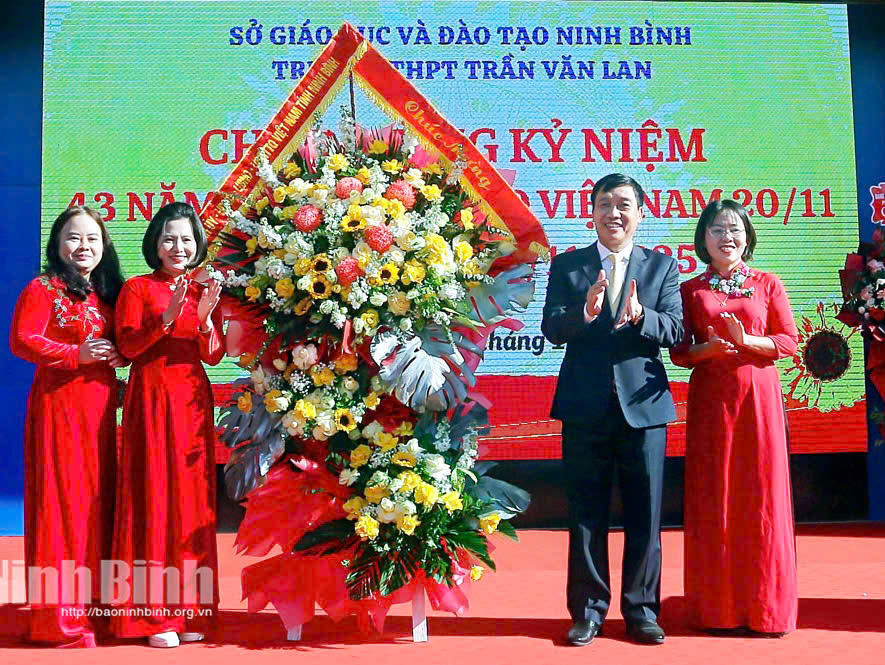 Đồng chí Mai Văn Quyết, Ủy viên Ban Thường vụ Tỉnh ủy, Giám đốc Sở Tài chính tỉnh Ninh Bình tặng hoa chúc mừng, phát biểu chỉ đạo và thông báo tin vui tới thầy trò Trường THPT Trần Văn Lan - Ảnh: Hồ Thanh