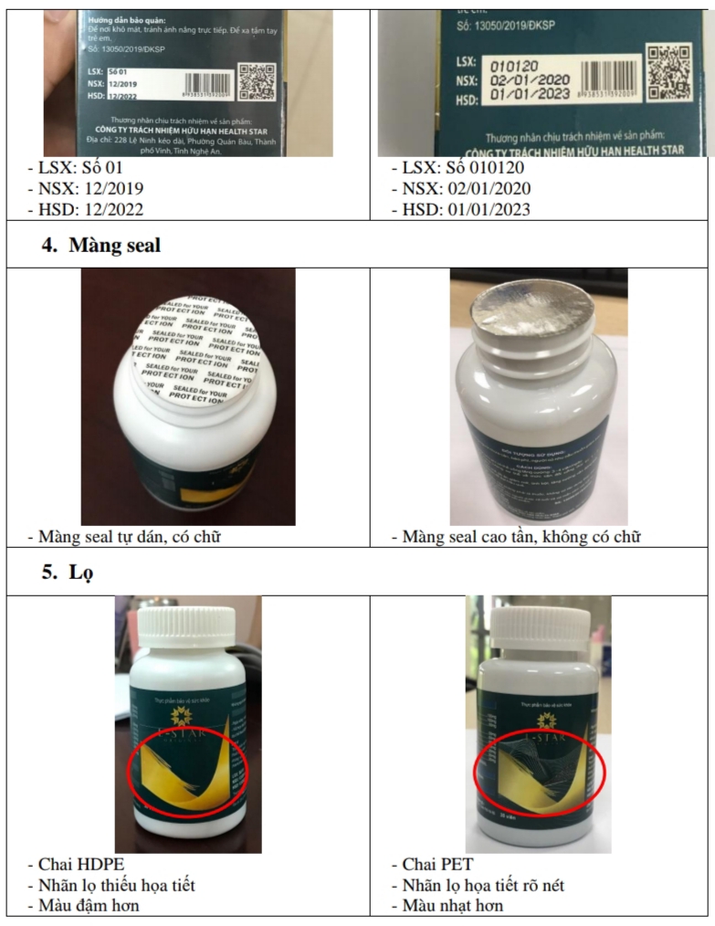Sản phẩm có đặt điểm: không dán tem Medistar tại đầu hộp, hoặc sản phẩm dán tem giả mạo tem của Medistar, thông tin số lô không đúng với lô hàng do Medistar sản xuất (LSX: Số 1, NSX: 12/2019, HSD: 12/2022), sao chép mẫu mã, kiểu dáng bao bì, nhãn hiệu hàng hóa “L - Star”. Giữa hàng giả, không chính hiệu nêu trên và lô hàng thật do Medistar sản xuất có rất nhiều sự khác biệt từ bên ngoài nhãn tới chai lọ, bột viên…”.