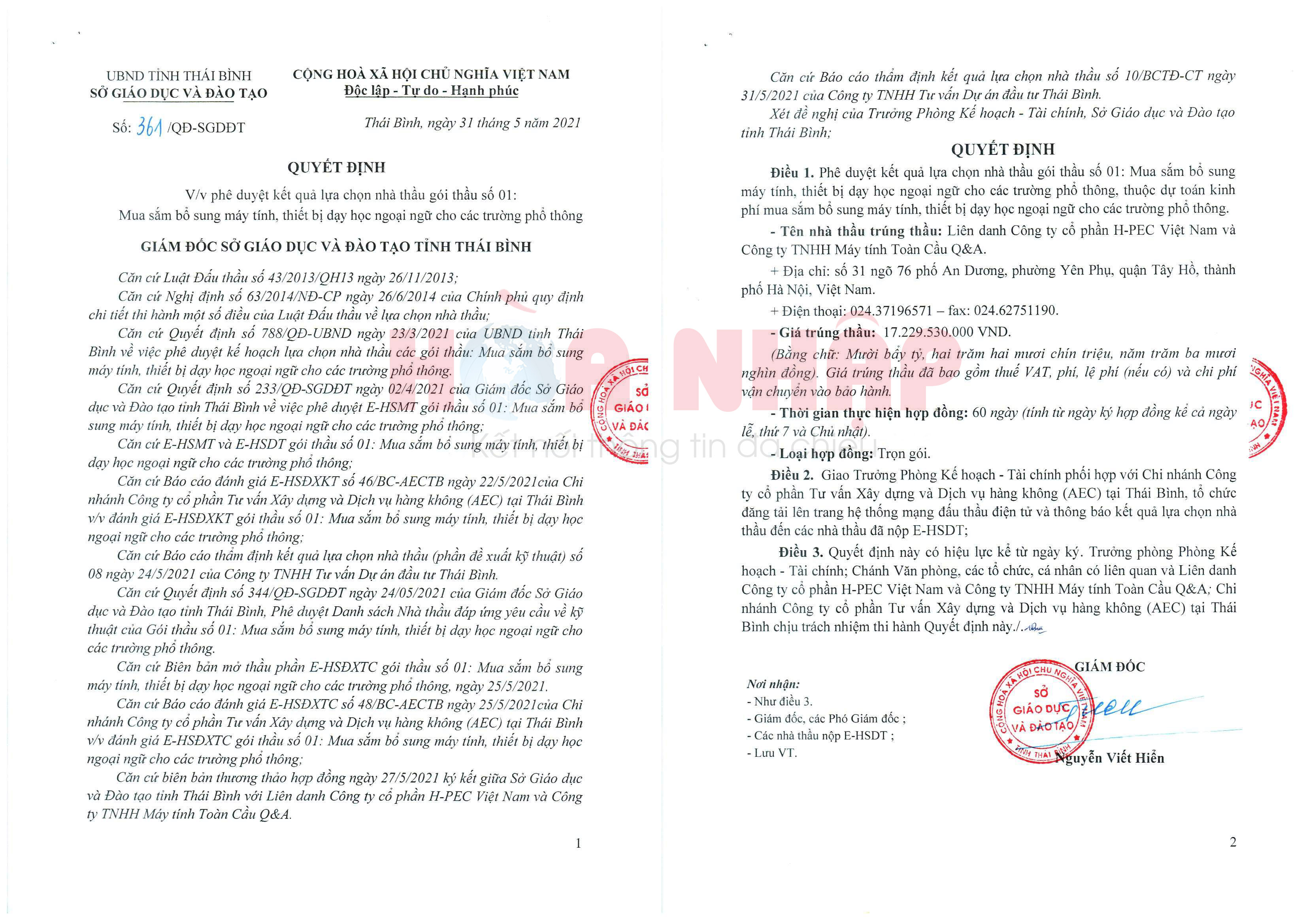Ở một diễn biến khác khi công bố gói thầu Mua sắm bố sung máy tính, thiết bị dạy học ngoại ngữ cho các trường phổ thông có số TBMT 20210407093 chỉ có 1 nhà thầu tham dự là Liên danh Công ty cổ phần H-PEC Việt Nam và Công ty TNHH Máy tính Toàn Cầu Q&A nhưng vì một lý do gì đấy sở GĐ và ĐT tỉnh Thái Bình đã ra quyết định SỐ 301/QĐ-SGDĐT ngày 28/04/2021 hủy gói thầu số 01: Mua sắm bố sung máy tính, thiết bị dạy học ngoại ngữ cho các trường phổ thông. Và sau đó ngày 31/05/2021 sở GĐ và ĐT tỉnh Thái Bình lại ra quyết định SỐ 361/QĐ-SGDĐT phê duyệt kết quả lựa chọn nhà thầu và nhà thầu Liên danh Công ty cổ phần H-PEC Việt Nam và Công ty TNHH Máy tính Toàn Cầu Q&A đã trúng thầu với giá dự thầu là 17.229.530.000 đ tiết kiệm được 8.879.200 tương đương 0.51%.