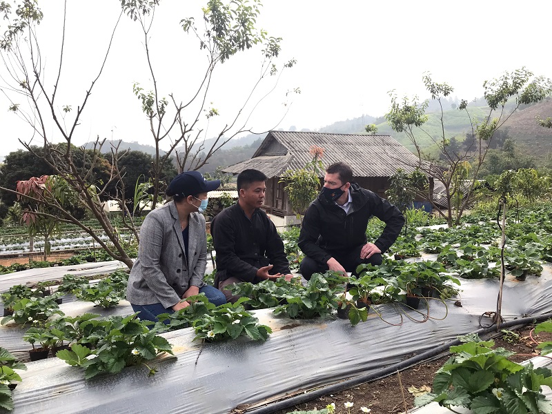 Phó Đại sứ Australia Mark Tattersall, Đại sứ quán Australia tại Việt Nam trò chuyện với anh Vi Văn Tùng tại trang trại dâu tây của anh ở Mộc Châu.