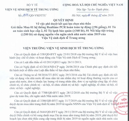 Ông Đặng Đức Anh (Viện trưởng Viện vệ sinh Dịch tễ Trung ương), ký phê duyệt Công ty Tâm Việt trúng gói thầu mua 01 hệ thống Realtime PCR hoàn toàn tự động (≥96 giếng), 01 tủ an toàn sinh học cấp 2, 02 tủ lạnh bảo quản (≥340 lít), 01 nồi hấp tiệt trùng (≥200 lít).