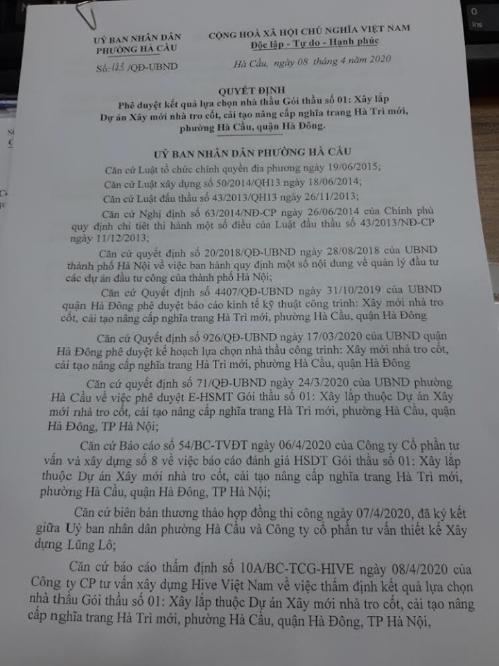 Ngày 8/4/2020, theo quyết định phê duyệt lựa chọn nhà thầu “Gói thầu số 1: Xây lắp dự án xây mới nhà tro cốt, cải tạo nâng cấp nghĩa trang Hà Trì mới phường Hà Cầu, quận Hà Đông” do ông Dương Thế Vinh - Chủ tịch UBND phường Hà Cầu ký, Công ty CP tư vấn thiết kế xây dựng Lũng Lô tiếp tục trúng thầu với giá 11.014.665.000 đồng.