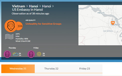 Cũng tại trạm quan trắc trên, chỉ 1 ngày sau (20/12), chỉ số AQI đã giảm xuống trong ngưỡng 100-150. Hay trong ngày 21/12 chỉ số AQI đo được lúc 10h sáng là 106. Dù có sự chênh lệch về chỉ số AQI giữa các trạm trong nước cũng như quốc tế, vẫn không thể phủ nhận thực tế tình trạng ô nhiễm không khí tại Thủ đô hiện nay có những thời điểm rất đáng báo động.