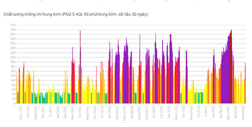 Ngày 19/12 vừa qua, trạm đo lường chất lượng không khí (AQI) đặt tại Đại sứ quán Mỹ (ở phố Láng Hạ, Hà Nội) cho kết quả lúc 11h là 357, thuộc nhóm không khí xấu, nguy hại. Theo thang đánh giá, chỉ số AQI hơn 300 thì chất lượng ở mức nguy hại. Ở mức này, mọi người được khuyến cáo nên ở trong nhà.