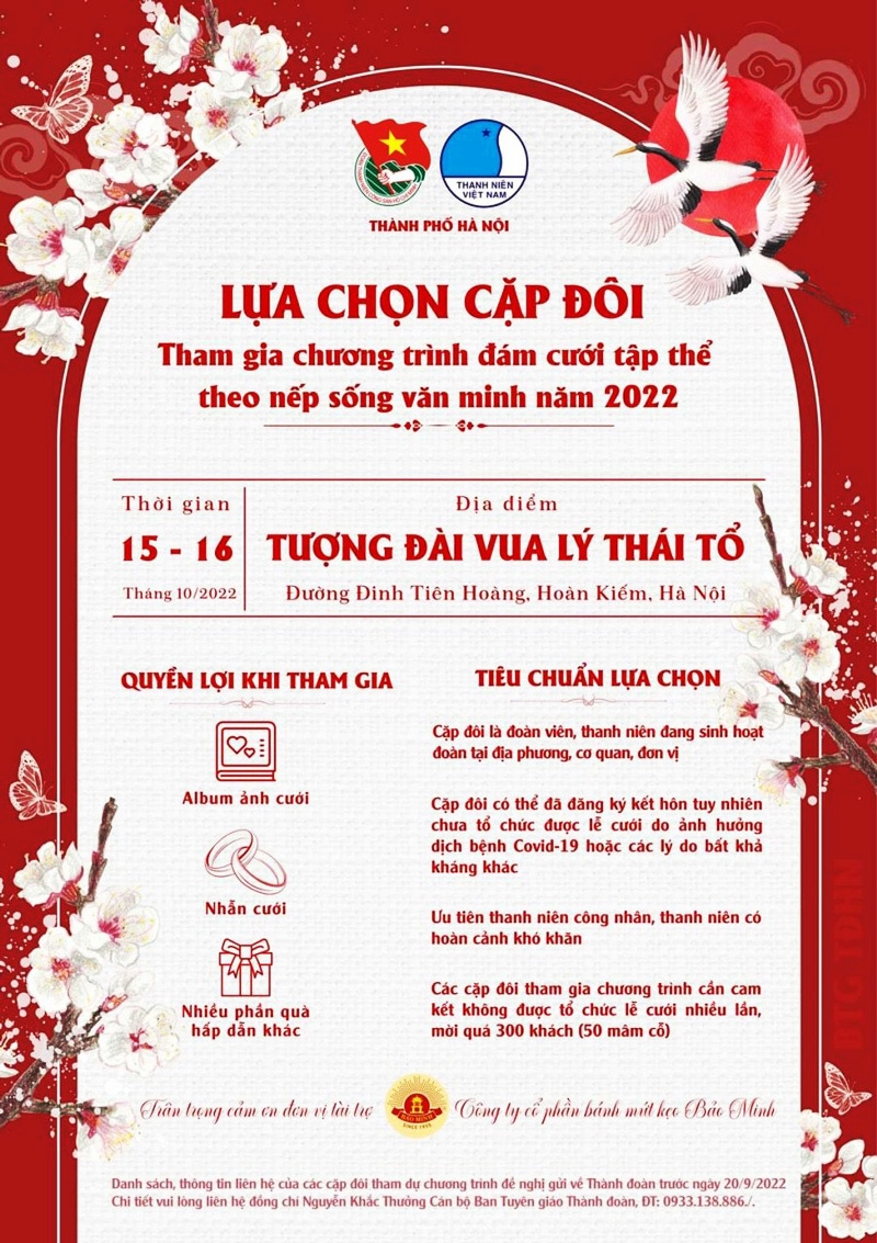 Theo báo Pháp luật xã hội, ngày 19/9, Thành đoàn, Hội Liên hiệp thanh niên Việt Nam thành phố Hà Nội thông tin về việc tuyển chọn các cặp đôi thanh niên tham dự chương trình đám cưới tập thể theo nếp sống văn minh năm 2022.