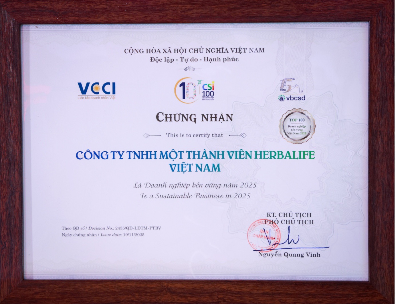 Herbalife Việt Nam đạt Chứng nhận Doanh nghiệp bền vững 2025.