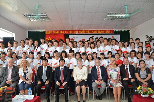 Đại sứ Đức Jutta Frasch và Thứ trưởng Bộ LĐ-TB&XH Nguyễn Trọng Đàm cùng các đại diện đối tác Đức và Việt Nam chụp ảnh lưu niệm với các học viên năm 2015