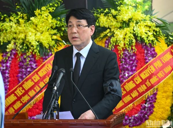 Chủ tịch nước Tô Lâm, nguyên Tổng Bí thư Nông Đức Mạnh, Thủ tướng Chính phủ Phạm Minh Chính, Chủ tịch Quốc hội Trần Thanh Mẫn, Thường trực Ban Bí thư Lương Cường cùng các đại biểu dự lễ an táng.