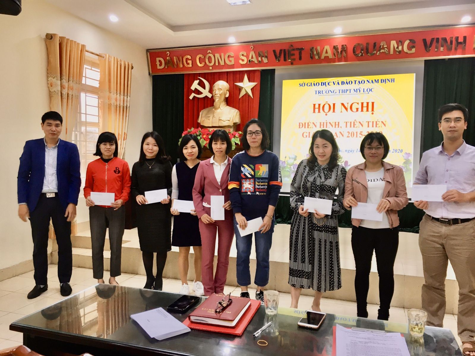Hiệu trưởng Nguyễn Duy Phương (ngoài cùng bên trái) trao thưởng cho cán bộ, giáo viên Trường THPT Mỹ Lộc tại hội nghị điển hình tiên tiến giai đoạn 2015-2019.