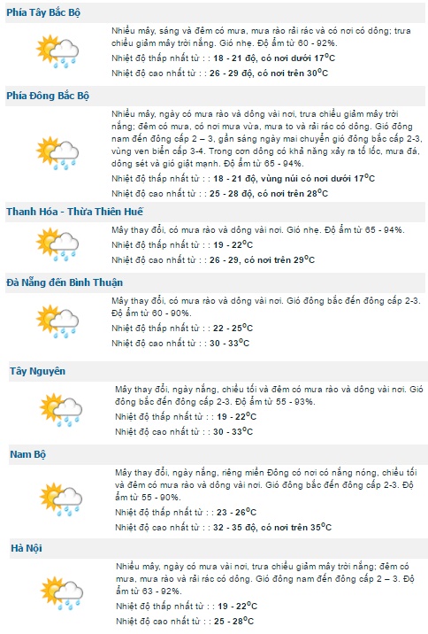 Do ảnh hưởng của không khí lạnh, từ đêm 30/03 đến hết ngày 31/03 ở Bắc Bộ có mưa, có nơi mưa vừa, mưa to và rải rác có dông; các tỉnh ven biển bắc và Trung Trung Bộ từ ngày 31/03 có mưa, mưa vừa, có nơi mưa to và rải rác có dông. Trong cơn dông có khả năng xảy ra tố lốc, mưa đá, dông sét và gió giật mạnh. Gió trong đất liền chuyển hướng đông bắc cấp 2-3, vùng ven biển cấp 3-4.