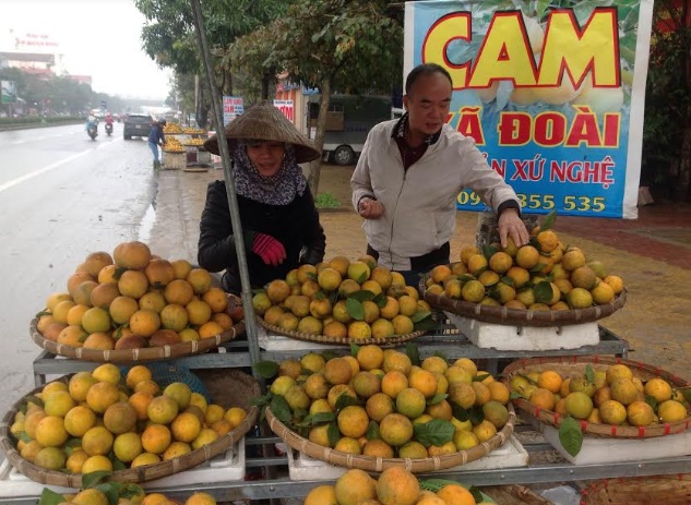 Vài năm trở lại đây, cứ vào dịp gần Tết, từ TP Vinh đến các chợ quê huyện Yên Thành, tiểu thương bày la liệt những mẹt cam với lời giới thiệu “Cam Xã Đoài”. Nghi ngờ về nguồn gốc, phóng viên Tạp chí Hướng nghiệp và Hòa nhập (hoanhap.vn) đã tìm về địa chỉ được ghi trên các thùng cam. Không khó khăn lắm khi chúng tôi tìm đến trang trại cam Thiên Sơn do ông Trịnh Xuân Giáo và ông Phạm Công Hải làm chủ và trại cam “ông Bình” do gia đình ông Nguyễn Hữu Bình đầu tư tại xóm Đông Trung, xã Đồng Thành, huyện Yên Thành, tỉnh Nghệ An. Trong 3 chủ trang trại nói trên, ông Bình là người rất giỏi về kỹ thuật trồng cam bởi ông có thâm niên từ thời còn là công nhân ở Nông trường 3/2 Quỳ Hợp. Trang trại cam của ông Giáo khoảng 18 ha, được đầu tư từ năm 2014. Theo cam kết giữa ông Giáo, ông Hải và ông Bình, ông Giáo đầu tư toàn bộ chi phí, lợi nhuận được chia như sau: ông Giáo 50%, ông Hải trông coi trang trại, quản lý chăm sóc, thu hái, được hưởng 25% và ông Bình chịu trách nhiệm về kỹ thuật, được hưởng 25%.