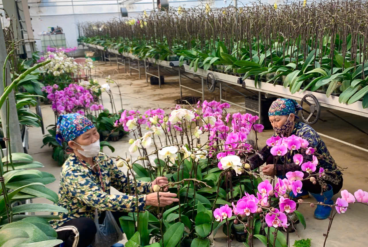 Chăm sóc hoa lan hồ điệp tại HTX Sản xuất và Kinh doanh Hoa cây cảnh Nam Phong, phường Vị Khê, tỉnh Ninh Bình - Ảnh: Hồ Thanh