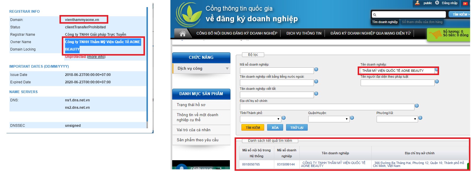 Theo thông tin từ bệnh nhân trên cung cấp, chúng tôi tìm được Fanpage Thẩm mỹ Dr Vương (@thammy.dr.vuong). Trang này đặt địa chỉ tại 61 Vũ Thạnh, phường Ô Chợ Dừa, Quận Đống Đa, TP Hà Nội. Số điện thoại liên hệ: 098 331 23 45. Về bác sĩ Vương, phần giới thiệu ghi: Thạc sỹ, bác sỹ Vũ Văn Vương - Phẫu thuật viên tạo hình thẩm mỹ (CCHN số 004369/BYT-CCHN). Fanpage này được liên kết với 1 website có địa chỉ www.vienthammyaone.vn, tuy nhiên website này hiện đã bị xóa và không thể truy cập được. Mặc dù vậy khi kiểm tra về quản lý tên miền thì cơ quan đăng ký là Công ty TNHH Thẩm Mỹ Viện Quốc Tế AONE BEAUTY. Khi chúng tôi kiểm tra tên công ty thì lại có địa chỉ ở 366 Đường Ba Tháng Hai, Phường 12, Quận 10, Thành phố Hồ Chí Minh. Và hoàn toàn không có chi nhánh ở Hà Nội.