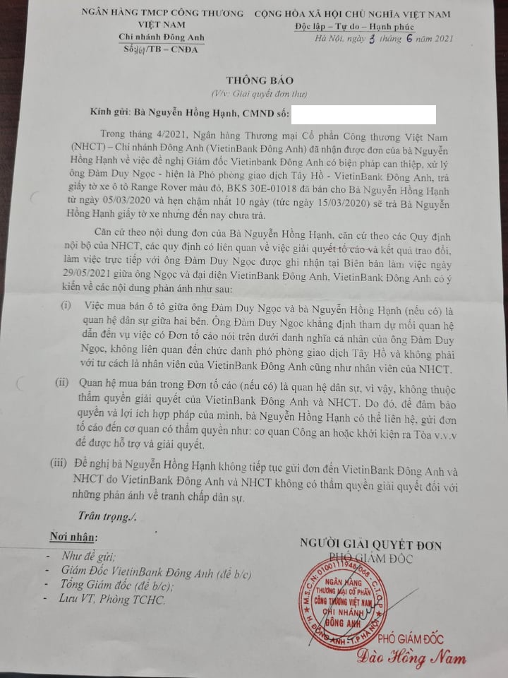 Thông báo số 161/TB-CNĐA ngày 03/06/2021 về việc giải quyết đơn thư, ông Đào Hồng Nam, Phó giám đốc chi nhánh Đông Anh khẳng định, ông Đàm Duy Ngọc hiện là Phó trưởng phòng giao dịch Tây Hồ.