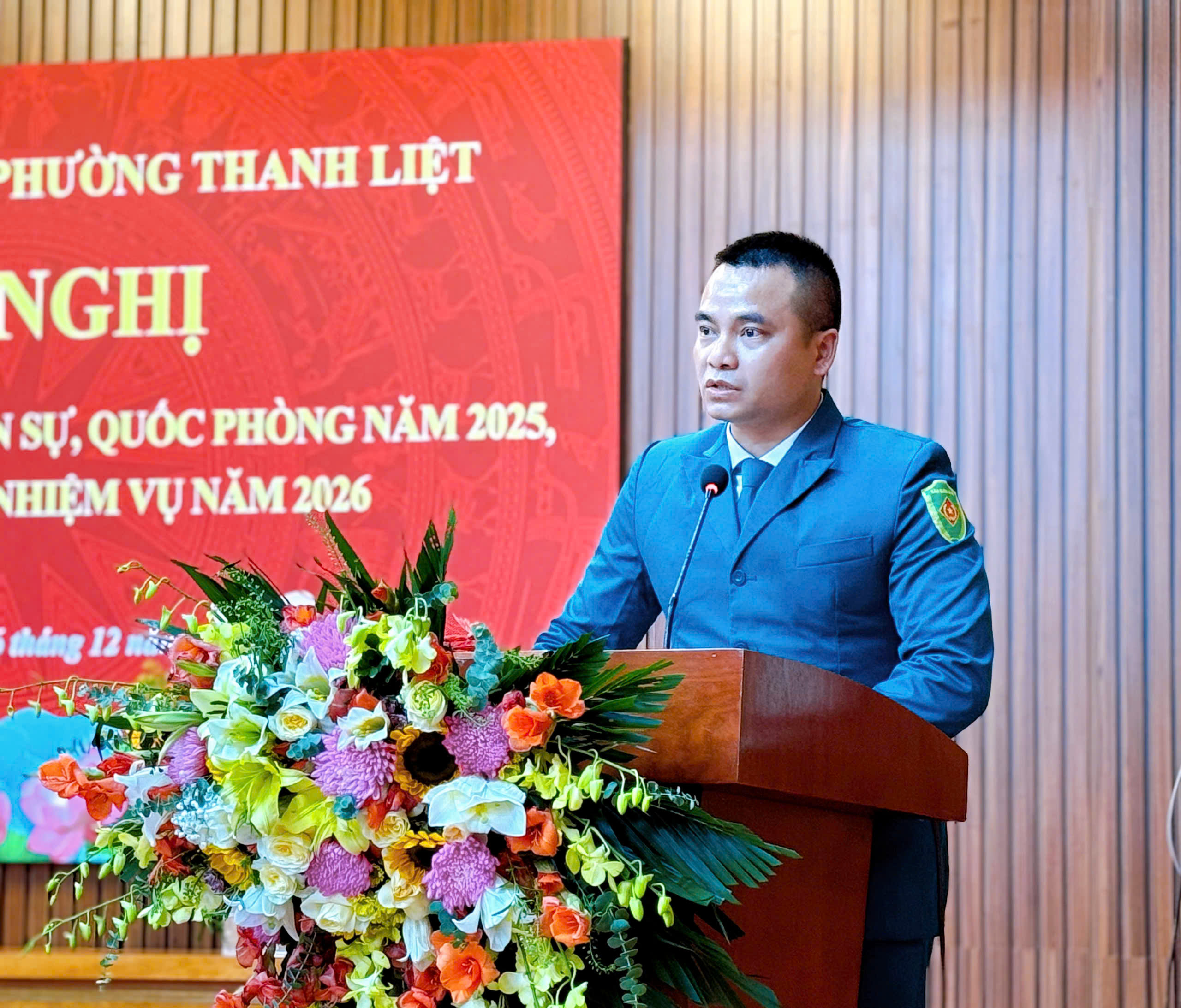 Báo cáo tại hội nghị, đồng chí Triệu Đình Tuyến – Chỉ huy trưởng Ban Chỉ huy Quân sự phường cho biết: Năm 2025, trong bối cảnh thực hiện sắp xếp đơn vị hành chính theo mô hình chính quyền địa phương 02 cấp, công tác quân sự, quốc phòng địa phương của phường Thanh Liệt được triển khai với khối lượng nhiệm vụ lớn. Song, dưới sự lãnh đạo, chỉ đạo của cấp ủy, chính quyền địa phương, Ban Chỉ huy Quân sự phường đã chủ động tham mưu, phối hợp chặt chẽ với Công an phường và các ban, ngành, đoàn thể nắm chắc tình hình địa bàn, duy trì nghiêm chế độ trực sẵn sàng chiến đấu, bảo vệ an toàn các ngày lễ, tết và các sự kiện chính trị quan trọng của đất nước và địa phương, góp phần giữ vững ổn định an ninh chính trị, trật tự an toàn xã hội trên địa bàn.