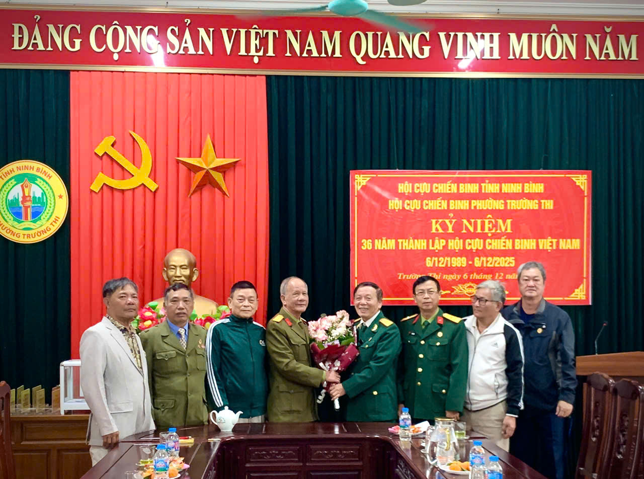 Tại buổi gặp mặt, lãnh đạo phường Trường Thi, các chi hội trưởng chi hội CCB đã chúc mừng, trao tặng Hội CCB phường bó hoa tươi thắm. Trước đó, Thường trực Hội CCB phường Trường Thi cũng đã đến tặng hoa, chúc mừng Hội CCB tỉnh Ninh Bình nhân dịp kỷ niệm 36 năm Ngày thành lập Hội CCB Việt Nam (06-12-1989 – 06-12-2025),