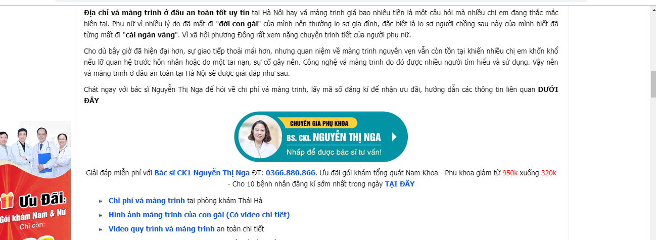 HOANHAP.VN - Trong danh mục kỹ thuật do Sở Y tế Hà Nội cấp thì Phòng khám đa khoa Thái Hà (11 Thái Hà, Hà Nội), không được phép thực hiện dịch vụ: Vá màng trinh; Thu nhỏ âm đạo, nhưng cơ sở này vẫn ngang nhiên quảng cáo rầm rộ trên website.