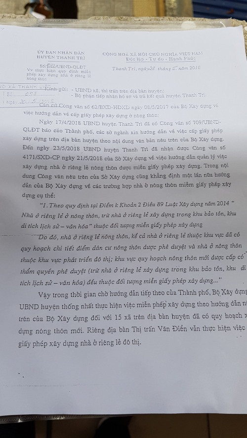Theo đó, UBND huyện Thanh Trì thực hiện việc miễn phép xây dựng theo hướng dẫn của Bộ Xây dựng đối với 15 xã trên địa bàn huyện đã có quy hoạch xây dựng nông thôn mới. Riêng Thị trấn Văn Điển vẫn thực hiện việc cấp giấy phép xây dựng nhà ở riêng lẻ đô thị. Theo đó, toàn bộ các công trình xây dựng trên địa bàn giờ chỉ quản lý theo quy hoạch H2-3.