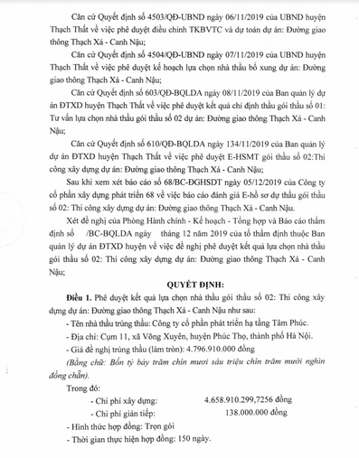 Ngày 6/12/2019, ông Phùng Khắc Sơn – Giám đốc Ban quản lý đầu tư xây dựng huyện Thạch Thất ký quyết định phê duyệt kết quả lựa chọn nhà thầu cho Công ty Tâm Phúc (huyện Phúc Thọ, Hà Nội) trúng thầu với giá 4.796.910.000VNĐ. Tiết kiệm 17 triệu đồng so với giá mời thầu. Mức tiết kiệm cực thấp cho ngân sách nhà nước