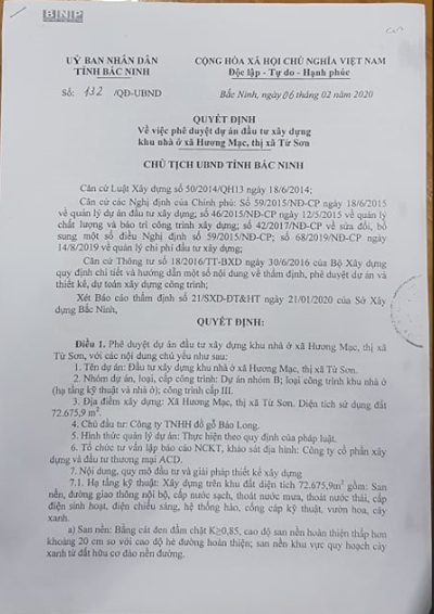 Quyết định số 132/QĐ-UBND về việc phê duyệt dự án đầu tư xây dựng khu nhà ở xã Hương Mạc, thị xã Từ Sơn do chủ tịch UBND tỉnh Bắc Ninh, Nguyễn Hương Giang ký ngày 6/2/2020, nhưng trước đó công ty Bảo Long đã ra bán và nhận tiền của nhiều khách hàng.