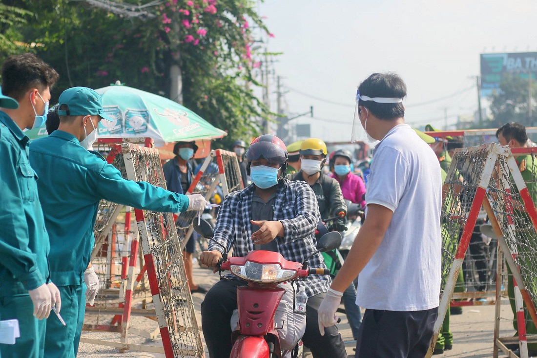 Lực lượng chức năng lập danh sách người dân các tỉnh để hỗ trợ đưa về quê tại chốt kiểm soát TP.HCM giáp ranh Long An.