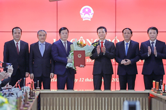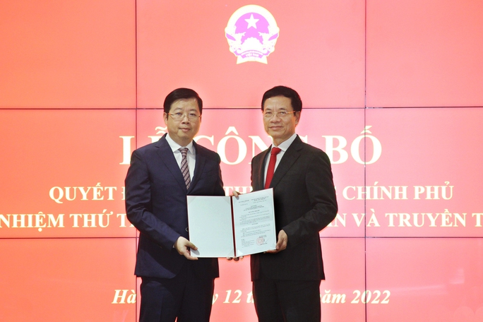 Bộ trưởng Nguyễn Mạnh Hùng trao quyết định bổ nhiệm của Thủ tướng cho ông Nguyễn Thanh Lâm. Ảnh: vtc.vn