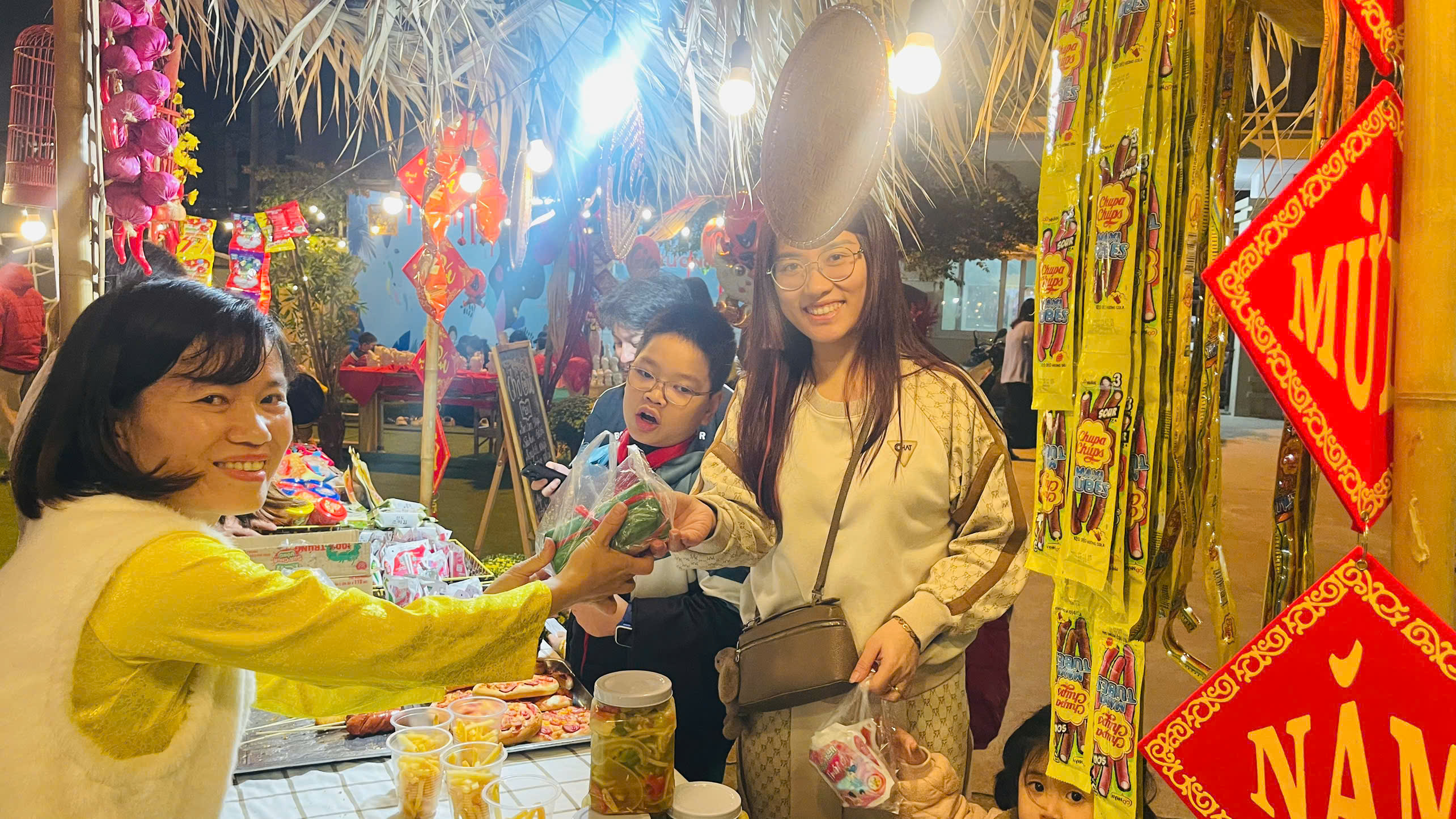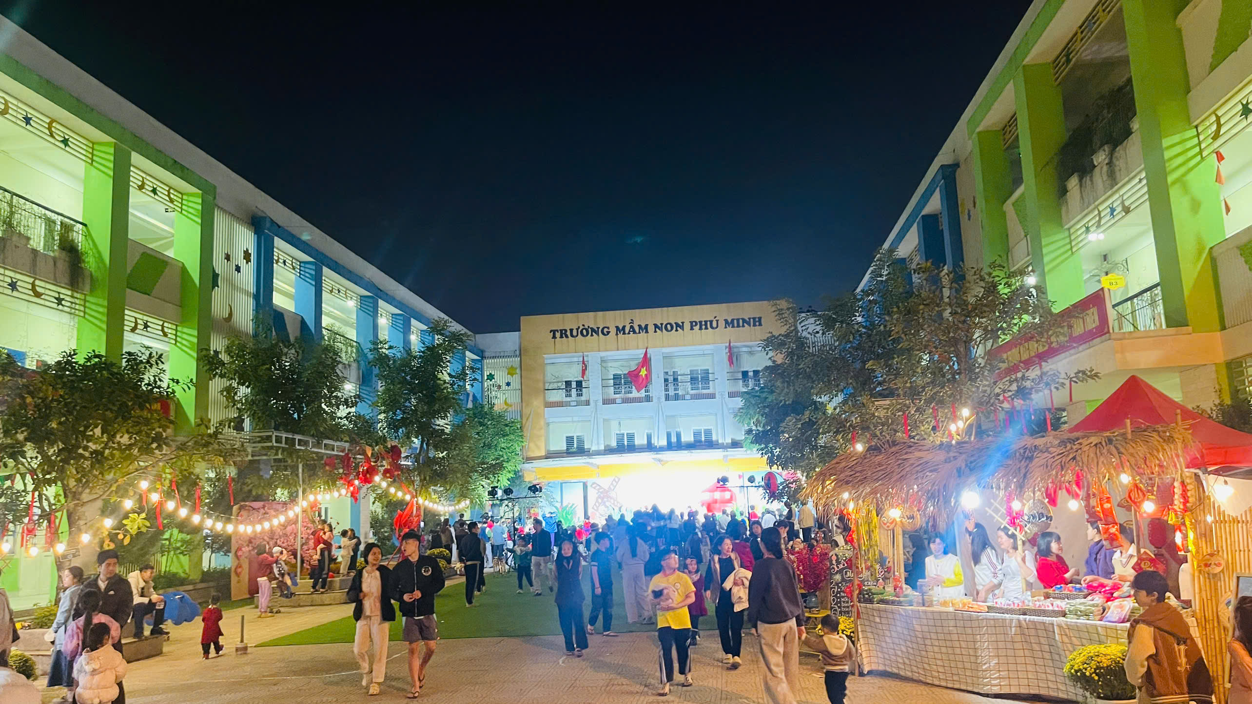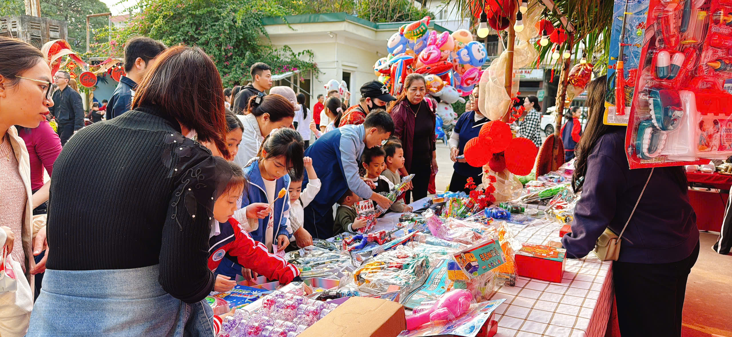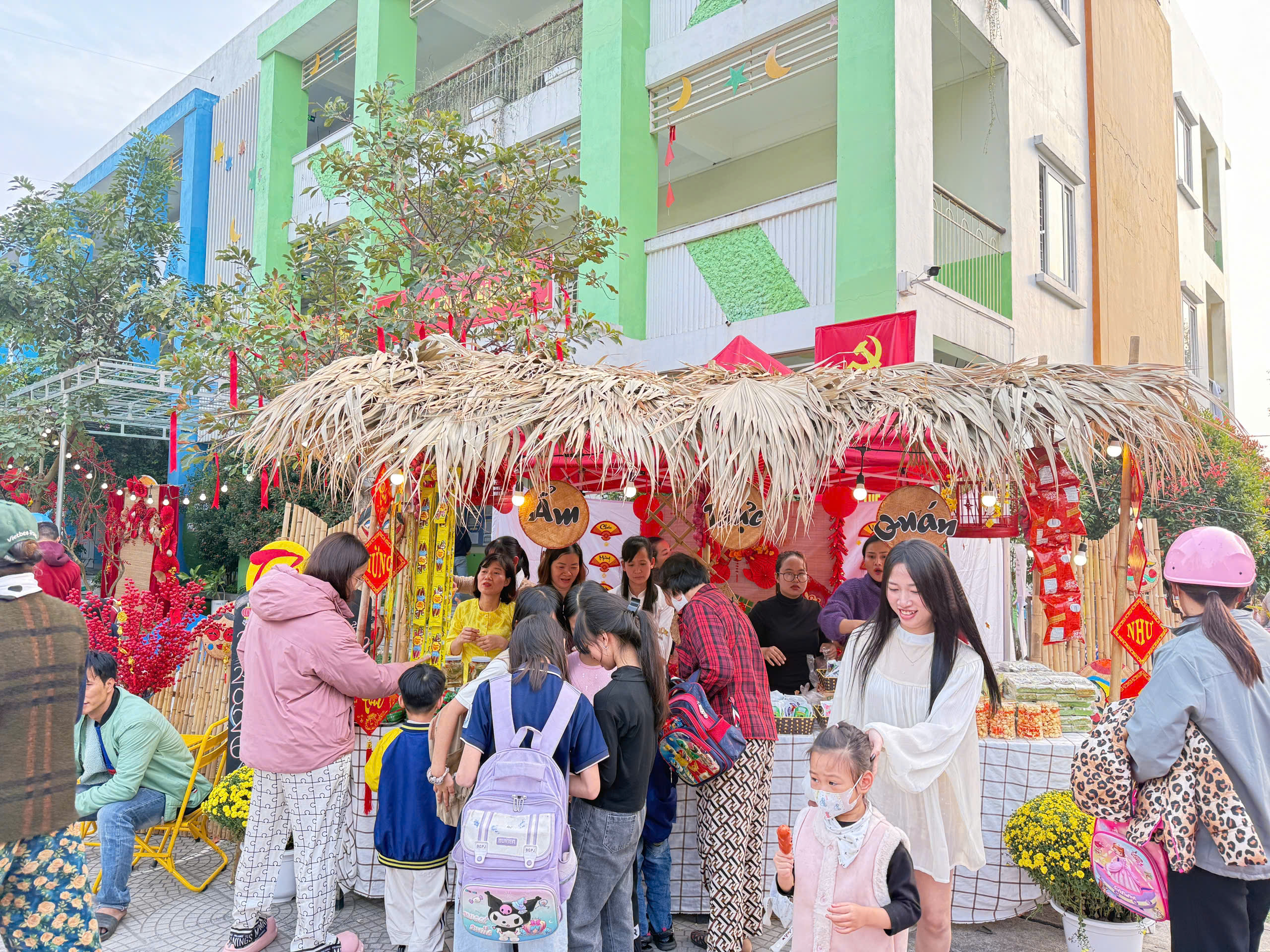 Ngay từ sáng sớm, sân trường đã khoác lên mình diện mạo mới rực rỡ sắc Xuân với sân khấu trung tâm, khu check-in và những gian hàng Tết được trang trí sinh động. Hội chợ Xuân với mỗi khối một gian hàng đã trở thành không gian đầy sắc xuân, như tái hiện lại phiên chợ Tết của các vùng quê Việt Nam với: Khu ẩm thực, Khu tô tượng, gian hàng quà quê, gian hàng đồ chơi. Tại các gian hàng, phụ huynh và học sinh mua sắm nhộn nhịp, cảnh mua bán diễn ra tấp nập làm cho chúng ta liên tưởng đây là hội chợ xuân ở vùng quê thật sự. Các trò chơi dân gian diễn ra sôi động, mang lại những tràng cười giòn tan như: Nhảy bao bố, bịt mắt bắt vịt, phi tiêu, đi cà kheo, kéo co, câu cá…