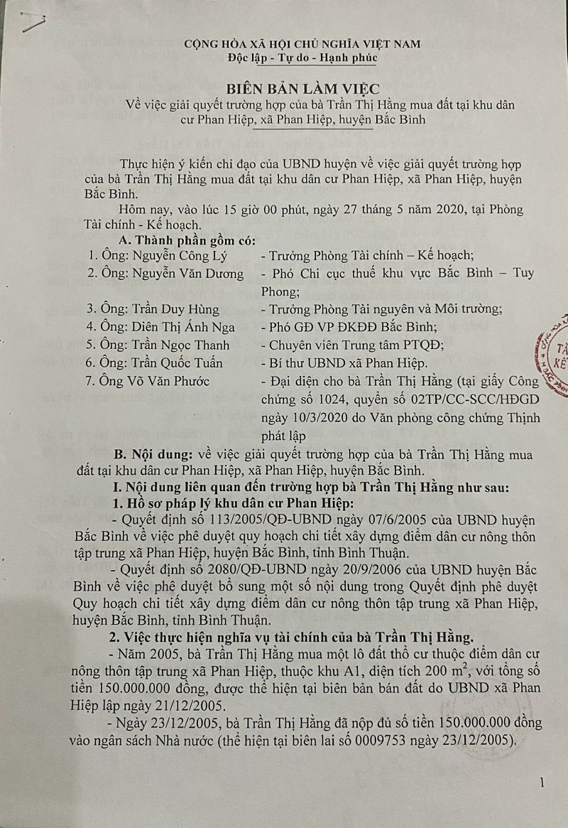 Cụ thể ngày 21/12/2005, tại trụ sở UBND xã Phan Hiệp, UBND huyện Bắc Bình tiến hành họp lập biên bản và giải quyết đất thổ cư mà UBND huyện đã thống nhất bán cho bà Hằng. Trong nội dung văn bản ghi rõ "Được sự chỉ đạo của UBND huyện Bắc Bình và chỉ tiêu ngân sách của xã năm 2005. Tại cuộc họp vào thời điểm đó đại diện UBND huyện Bắc Bình là ông Đào Công Danh – Phó trưởng phòng tài chính huyện và về phía địa phương là ông Trần Văn Cư – Chủ tịch UBND xã Phan Hiệp, ông Đặng Văn Thư cán bộ địa chính xã. Theo biên bản này thì giữa chính quyền xã và huyện đã thống nhất bán cho bà Hằng lô đất theo mốc giới cụ thể được ghi trong biên bản.