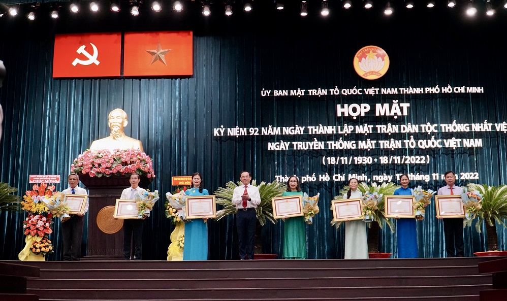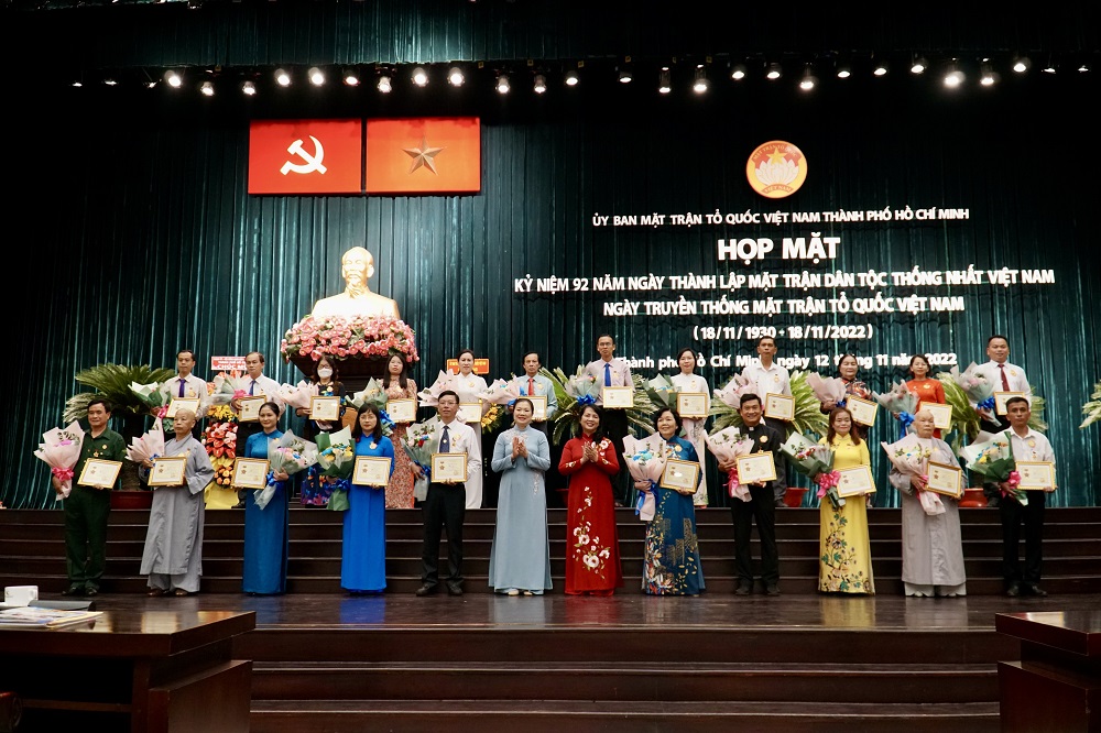 Dịp này, Thủ tướng Chính phủ tặng bằng khen cho 2 tập thể, 5 cá nhân có thành tích xuất sắc trong công tác phòng chống dịch Covid-19 tại TP Hồ Chí Minh. Ủy ban MTTQ Việt Nam trao tặng kỷ niệm chương cho 147 cá nhân ghi nhận sự cống hiến cho sự nghiệp xây dựng khối đại đoàn kết toàn dân tộc và trong công tác mặt trận. Đồng thời, Ủy ban MTTQ Việt Nam TP Hồ Chí Minh trao giải thưởng “Đại đoàn kết toàn dân tộc TP Hồ Chí Minh” lần 3 năm 2022 cho 9 tập thể, 2 cá nhân.