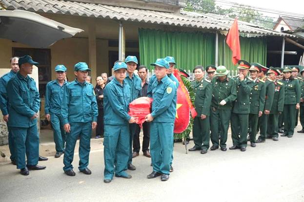 Đại diện lực lượng dân quân tự vệ, đoàn viên thanh niên cùng hội cựu chiến binh và bà con nhân dân đưa hài cốt liệt sĩ là nghĩa trang liệt sĩ tại địa phương.