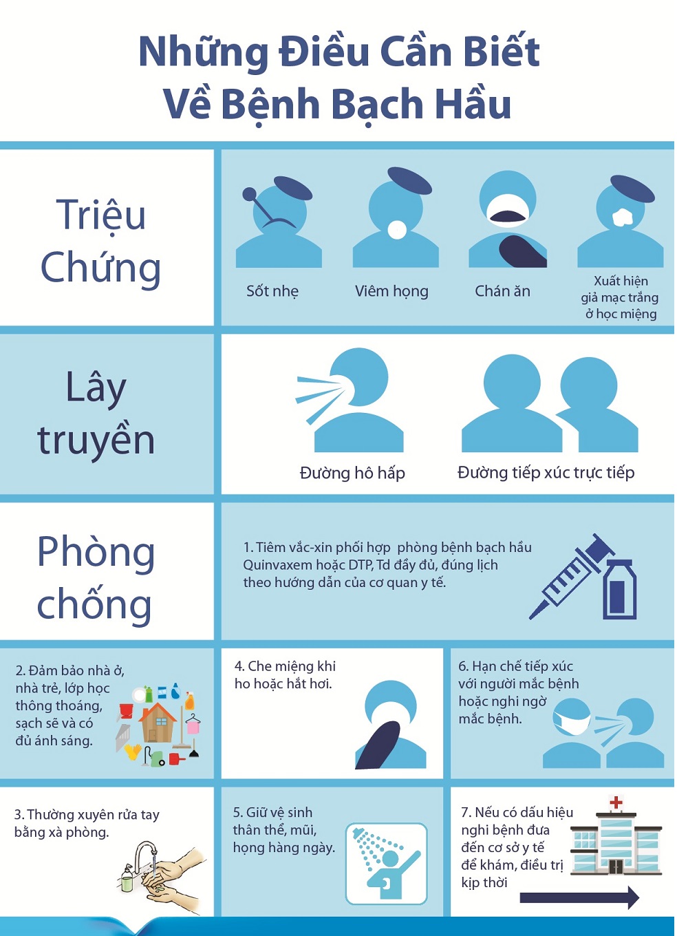 Triệu chứng của bệnh bạch hầu là sốt, viêm họng, chán ăn, xuất hiện giả mạc trắng ở hốc miệng; phòng ngừa tốt nhất là tiêm văcxin, nếu mắc bệnh cần giữ vệ sinh kỹ, theo bác sĩ Phan Lương Ánh Linh, Bệnh viện Đa khoa Tâm Trí Sài Gòn.