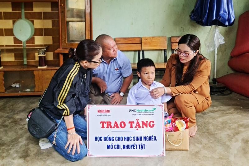 Sáng 9/8, tại thôn Kon Rờ Bàng, xã Vinh Quang, thành phố Kon Tum, Văn phòng đại diện Báo Nhân Dân tại Kon Tum phối hợp Công ty cổ phần Tập đoàn Phương Nam trao 45 bộ sách giáo khoa lớp 3 cho Trường Tiểu học Cao Bá Quát, quà và 8 suất học bổng cho các em học sinh dân tộc thiểu số nghèo, mồ côi, khuyết tật.