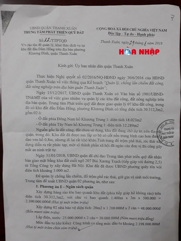 Tại Văn bản số 22/TTPTQĐ (V/v rào tôn để quản lý, khai thác dịch vụ tại khu đất Đầm Hồng trên địa bàn phường Khương Đình, quận Thanh Xuân) thể hiện.