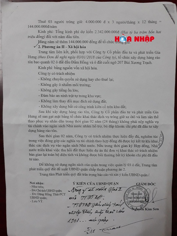Trong đó, phương án 1 là sử dụng nguồn ngân sách của quận, sau tính toán đầu tư ban đầu dự kiến là hơn 2 tỷ đồng thì phương án này không được lựa chọn và UBND quận đã đồng ý phương án 2 là xã hội hóa. Đó là trung tâm liên kết, phối hợp với Công ty Gia Hưng tổ chức xây dựng hàng rào tôn 02 ô đất đầu Đầm Hồng và ô đất cuối ngõ 207 Bùi Xương Trạch với tổng diện tích là 30.312,3m2, sau đó san gạt mặt bằng tổ chức khai thác dịch vụ trông giữ xe ô tô và làm sân bóng đá bằng nguồn vốn xã hội hóa. Trong thời gian 2 năm Cty Gia Hưng không phải nộp nghĩa vụ tài chính vào ngân sách Nhà nước nhằm hỗ trợ, bù đắp khoản chi phí đã đầu tư xây dựng hàng rào tôn…
