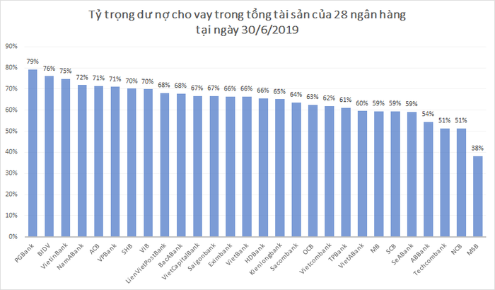 Tỷ trọng dư nợ cho vay trong tổng tài sản của 28 ngân hàng Việt Nam tại ngày 30/6/2019