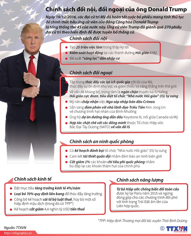 Ngày 19/12, các đại cử tri Mỹ đã hoàn tất cuộc bỏ phiếu mang tính thủ tục để chính thức bầu ứng cử viên của đảng Cộng hòa Donald Trump là tổng thống thứ 45 của nước này. Ứng cử viên Trump đã giành quá 270 phiếu đại cử tri theo hiến định để được tuyên bố thắng cử.
