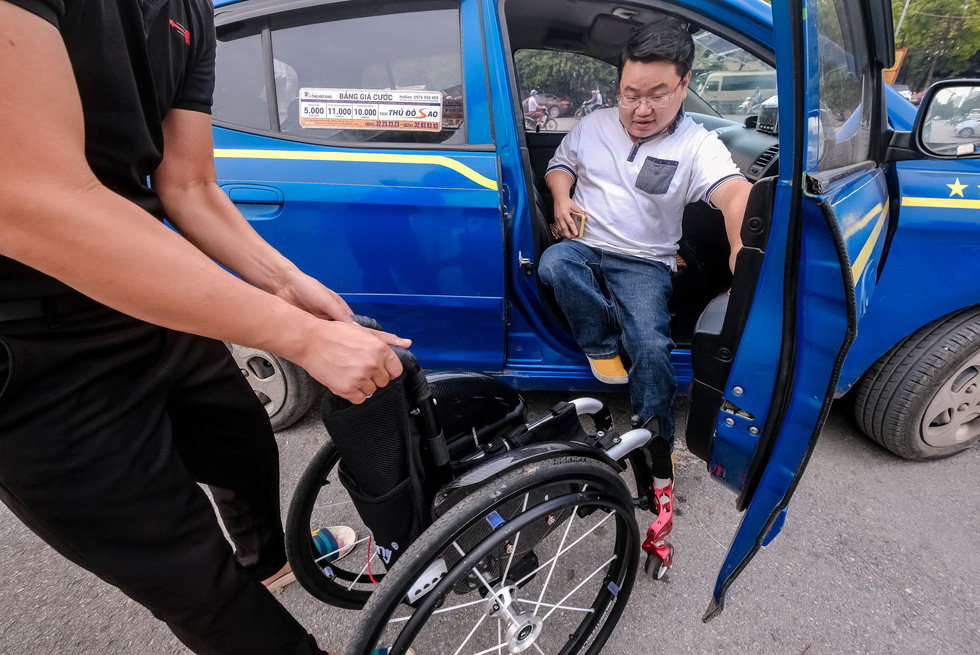 Từ ngày đặt chân đến thủ đô, anh lựa chọn phương tiện giao thông công cộng, bởi luôn có người tốt sẵn sàng giúp đỡ. Đến nơi, anh "khoe" vị trí xương tay phải mới lành được vài ngày, nay anh di chuyển xe lăn bằng tay trái.