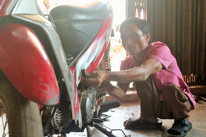 | Anh Phơi với ngón nghề sửa xe máy. THANH LỘC |