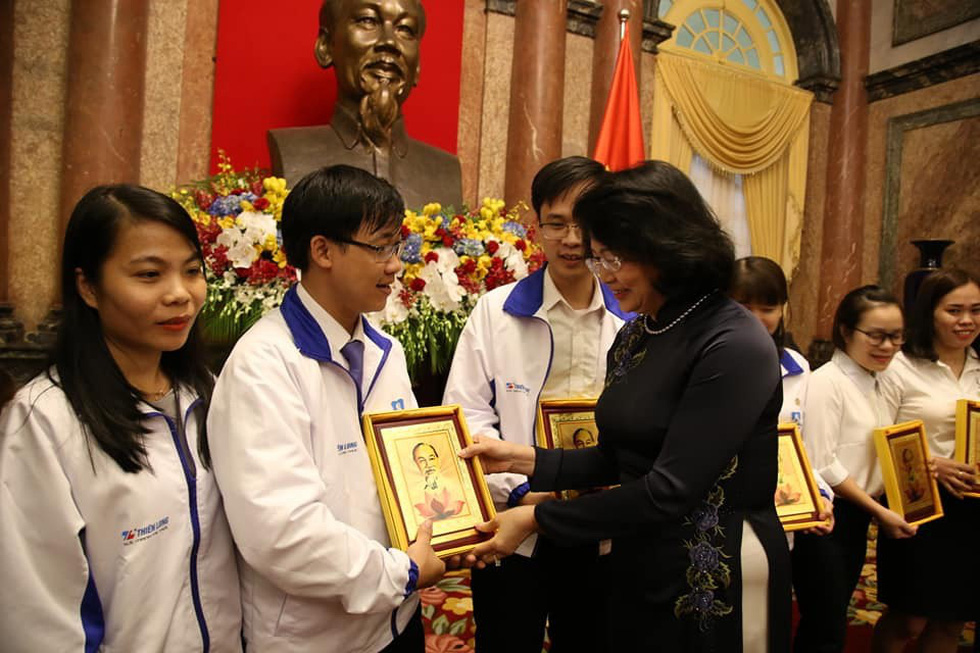 | Phó Chủ tịch nước Đặng Thị Ngọc Thịnh trao ảnh Bác Hồ cho thầy Việt trong lễ vinh danh "Chia sẻ cùng thầy cô" 2018 |