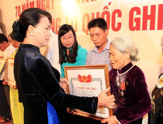 Chủ tịch Quốc hội Nguyễn Thị Kim Ngân trao bằng Tổ quốc ghi công cho thân nhân gia đình liệt sĩ.