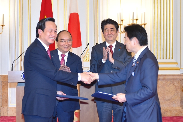 | Thủ tướng Nguyễn Xuân Phúc và Thủ tướng Nhật Bản Shinzo Abe chứng kiến lễ trao các văn kiện hợp tác về XKLĐ của cơ quan 2 nước. |