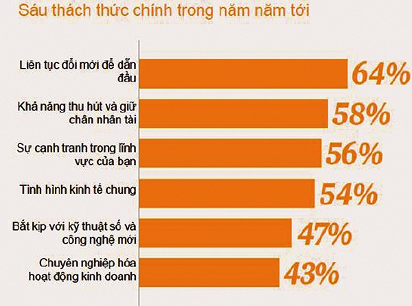 Kết quả khảo sát cũng cho thấy, đa số DN muốn cải tiến DN nhưng cũng hiểu rằng mình có trách nhiệm chuyển giao một DN vững chắc cho các thế hệ kế tiếp. Ông Hùng cho biết, các thế hệ kế thừa thường có tư duy cải tiến DN sau khi được kế thừa, trong đó 69% được hỏi cho biết sẽ tuyển dụng những nhân sự chuyên nghiệp từ bên ngoài để đem lại sự hiện đại và chuyên nghiệp hóa cho DN. Ngoài ra, 60% lựa chọn việc mở rộng thị trường ở khu vực địa lý mới và chỉ 47% đồng ý triển khai các dự án kinh doanh mạo hiểm song song với các hoạt động chính của DN.