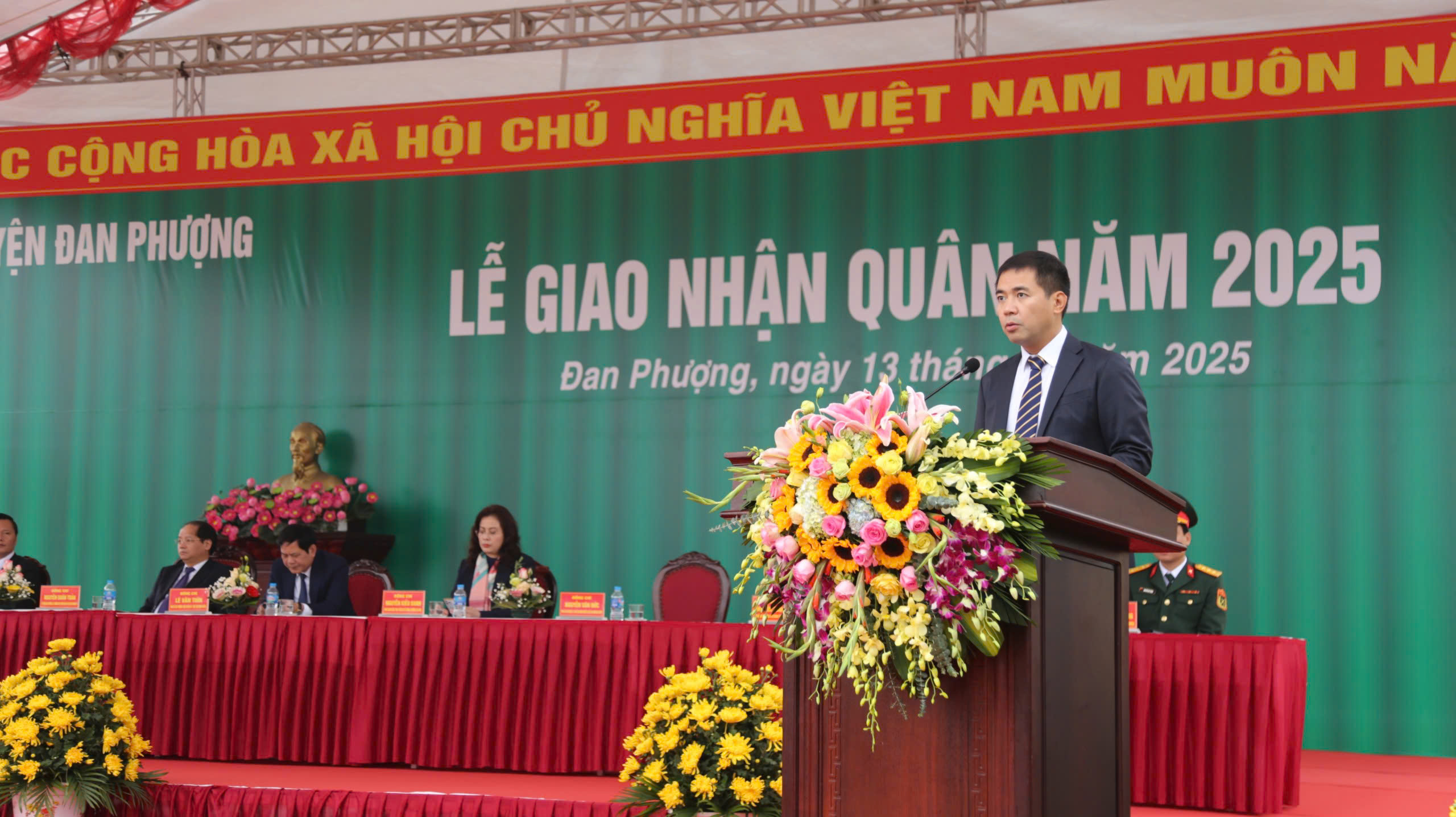 Ông Nguyễn Văn Đức - Chủ tịch UBND huyện Đan Phượng phát biểu tại Lễ giao nhận quân.
