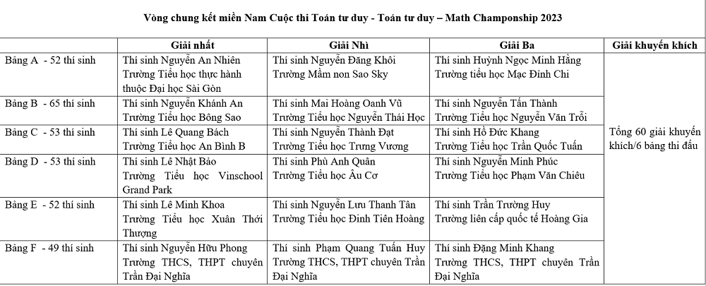 Ngày 12/11, tại TP Hồ Chí Minh, vòng chung kết miền Nam Cuộc thi tài năng Toán tư duy – Math Championship 2023 chính thức diễn ra với sự tranh tài của 324 thí sinh. Cuộc thi đo Trung tâm Phát triển Khoa học và Công nghệ trẻ TP Hồ Chí Minh phối hợp cùng Hội đồng Đội thành phố và Hệ thống Toán tư duy Hoa Kỳ Mathnasium Việt Nam tổ chức.