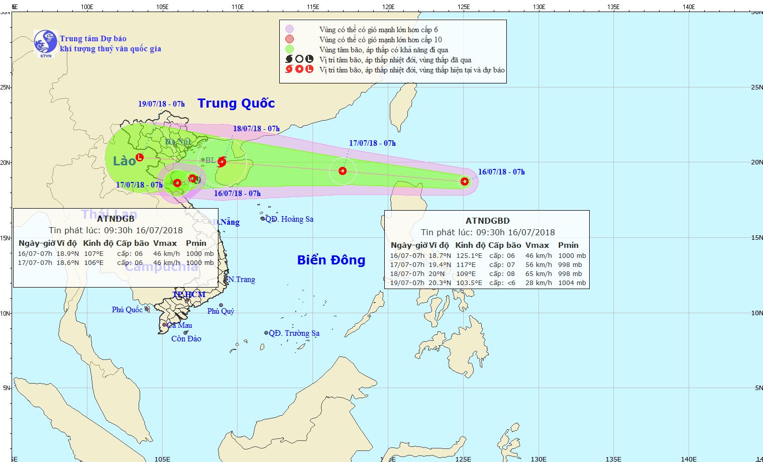 Hồi 7h, vị trí tâm áp thấp nhiệt đới ở vào khoảng 18,7 độ Vĩ Bắc; 125,1 độ Kinh Đông. Sức gió mạnh nhất vùng gần tâm áp thấp nhiệt đới mạnh cấp 6 (40-50 km/giờ), giật cấp 9.