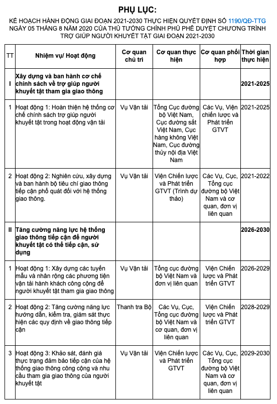 + Đảm bảo tối thiểu 30% người khuyết tật có nhu cầu tham gia giao thông được sử dụng phương tiện vận tải khách công cộng (như xe buýt) đảm bảo quy chuẩn kỹ thuật về giao thông tiếp cận, hoặc được hỗ trợ sử dụng phương tiện vận tải khách công cộng hay dịch vụ trợ giúp tương đương;