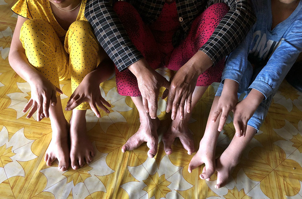 Đó là gia đình bà Huỳnh Thị Liễu (71 tuổi), sống tại xã Minh Thuận, huyện U Minh Thượng, tỉnh Kiên Giang. Hầu hết từ con đến cháu của bà đều có bàn tay, bàn chân chẳng giống người thường, chỉ từ 2- 3 ngón. Các ngón chân tay dài, tạo thành những gọng kìm hình vòng cung.